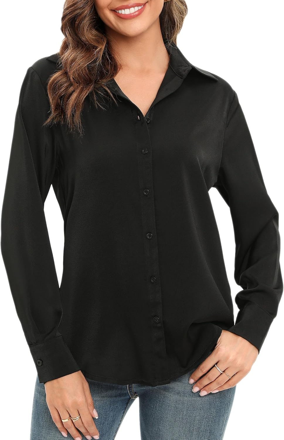 LUSMAY Women's Silky Satin Blouses Elegant Long Sleeve Button Down Collared Office Work Shirts Tops