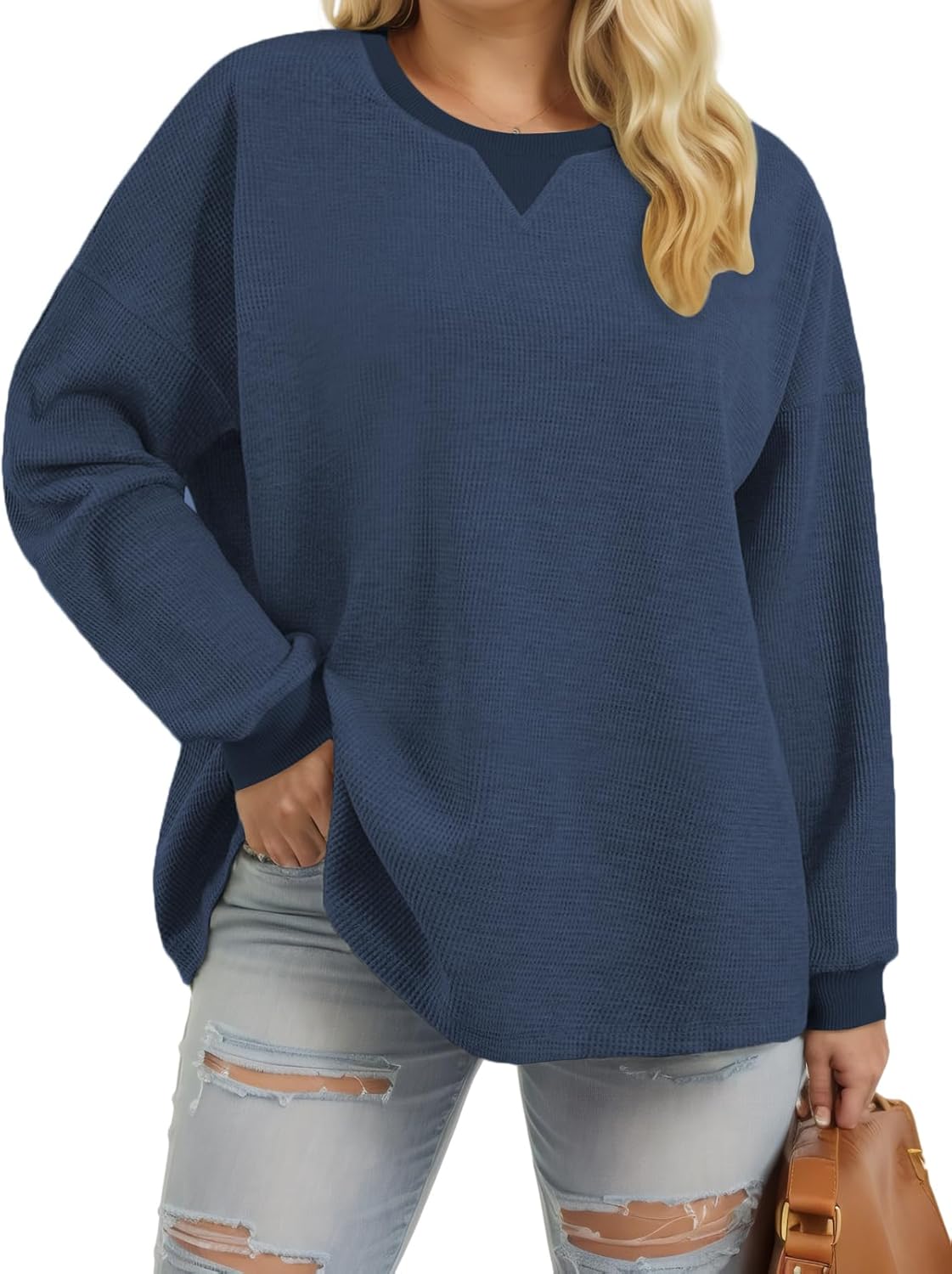 VISLILY Womens-Plus-Size-Sweatshirts Trendy Color Block Casual Long Sleeve Tops Waffle Knit Oversized Shirts Loose Fit Tunics