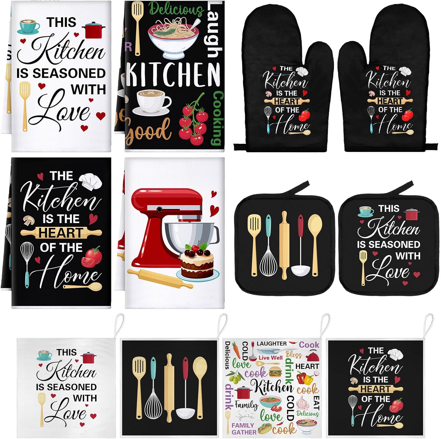 - Widely Applicable: these kitchen towels and oven mitts sets are convenient for daily use, effectively prevent your hands from getting hot, and are conveniently suitable for kitchens, hotels, restaurants, bakeries, etc., bringing you an easy cooking experience This complete set is not only suitable for your own kitchen, but also an ideal gift for housewarming, weddings, hostess gifts, etc. Funny colors scheme, cute kitchen themed quotes, create a thoughtful and exquisite gift