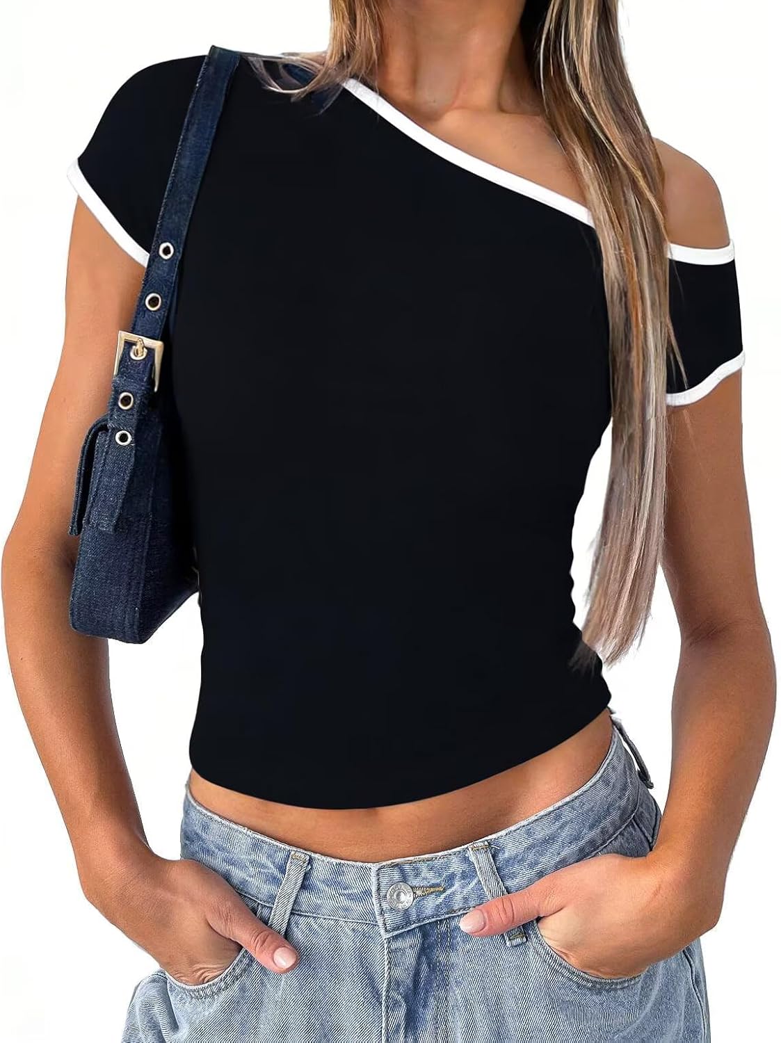 LEEDYA Off The Shoulder Tops for Women Summer Short Sleeve Basic Slim Fit Crop Top Sexy Y2K Going Out T Shirts