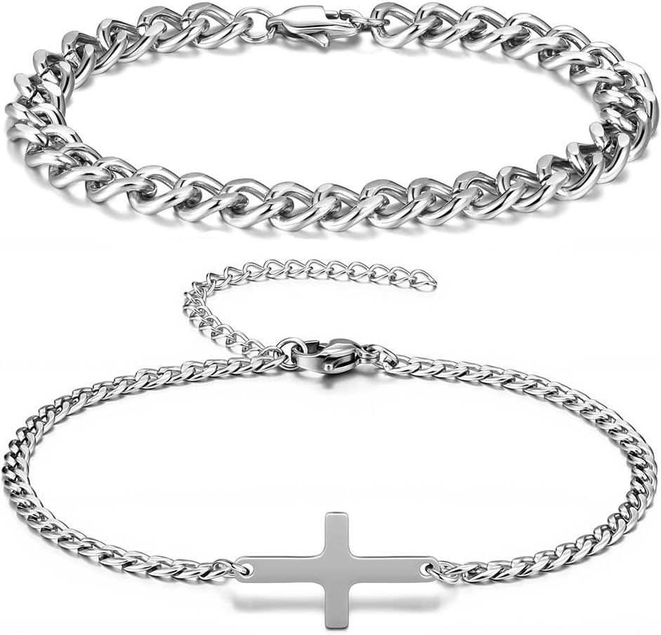 Personalized Master Stainless Steel Mens Cross Chain Bracelet, Adjustable Sturdy Silver Cuban Rolo Cable Figaro Bracelet Set for Men, 2-5Pcs