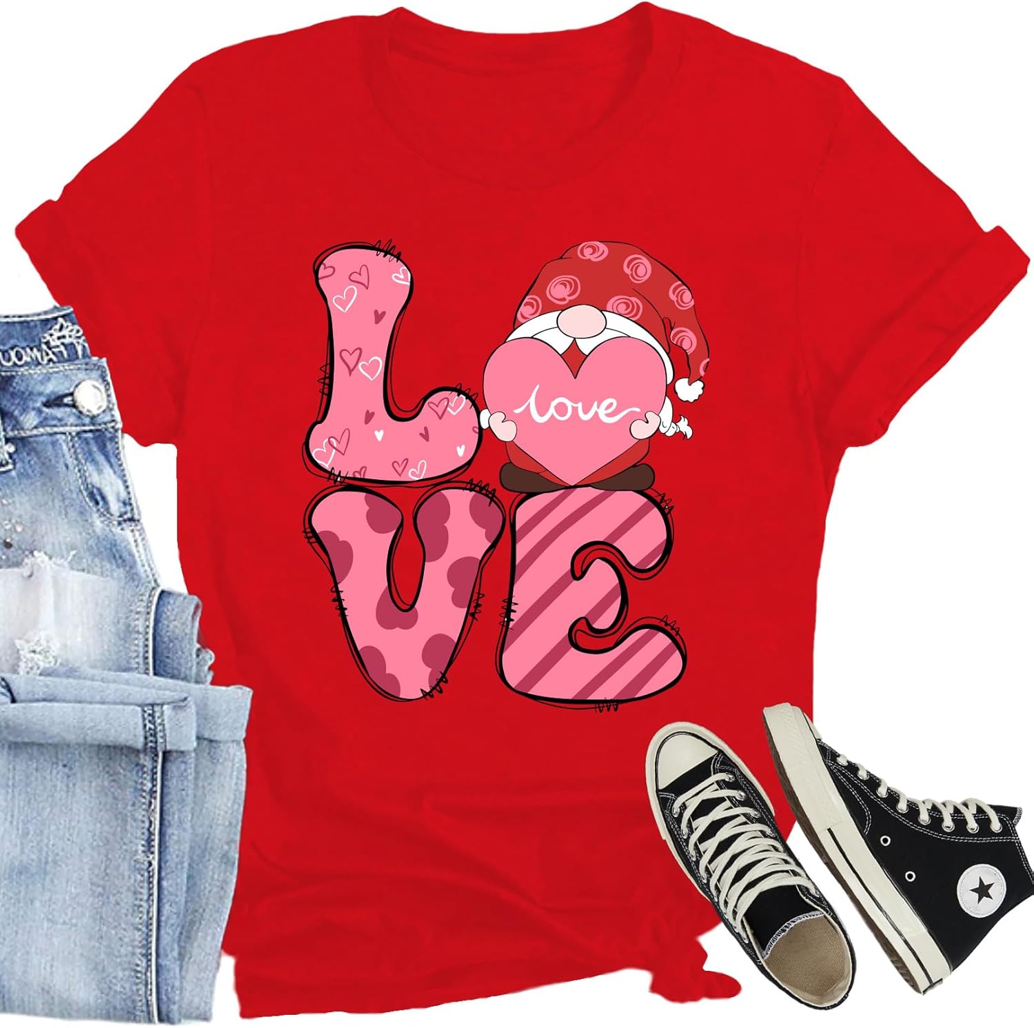 Women Valentines Day Shirts Cute Gnome Love Heart T-Shirt Casual Lover Wife Day Tee Tops