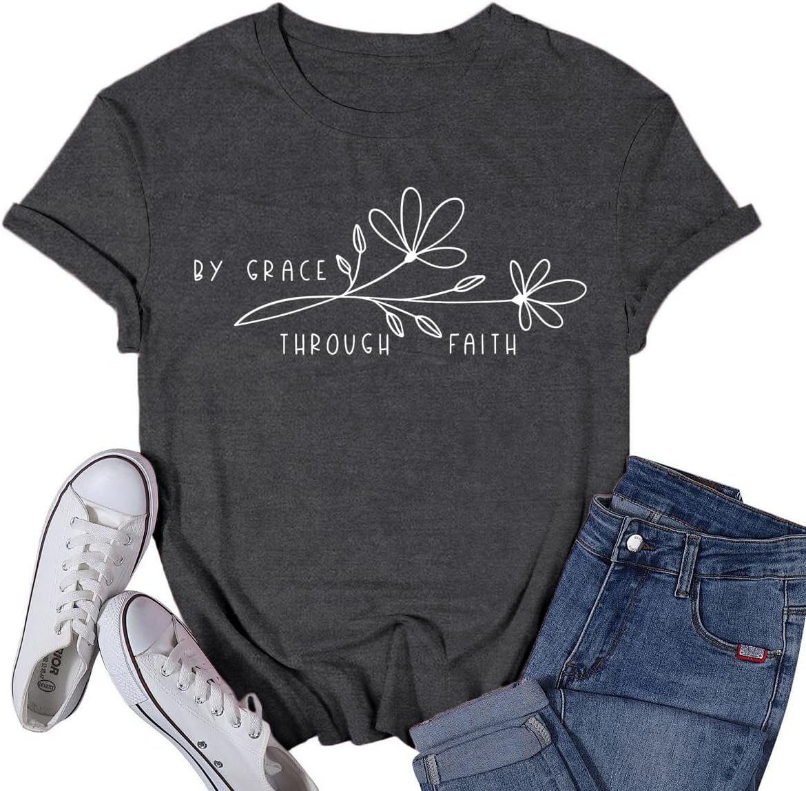 Womens Christian Shirt Christ Faith T-Shirts Bible Verse by Grace Through Faith Tee Tops