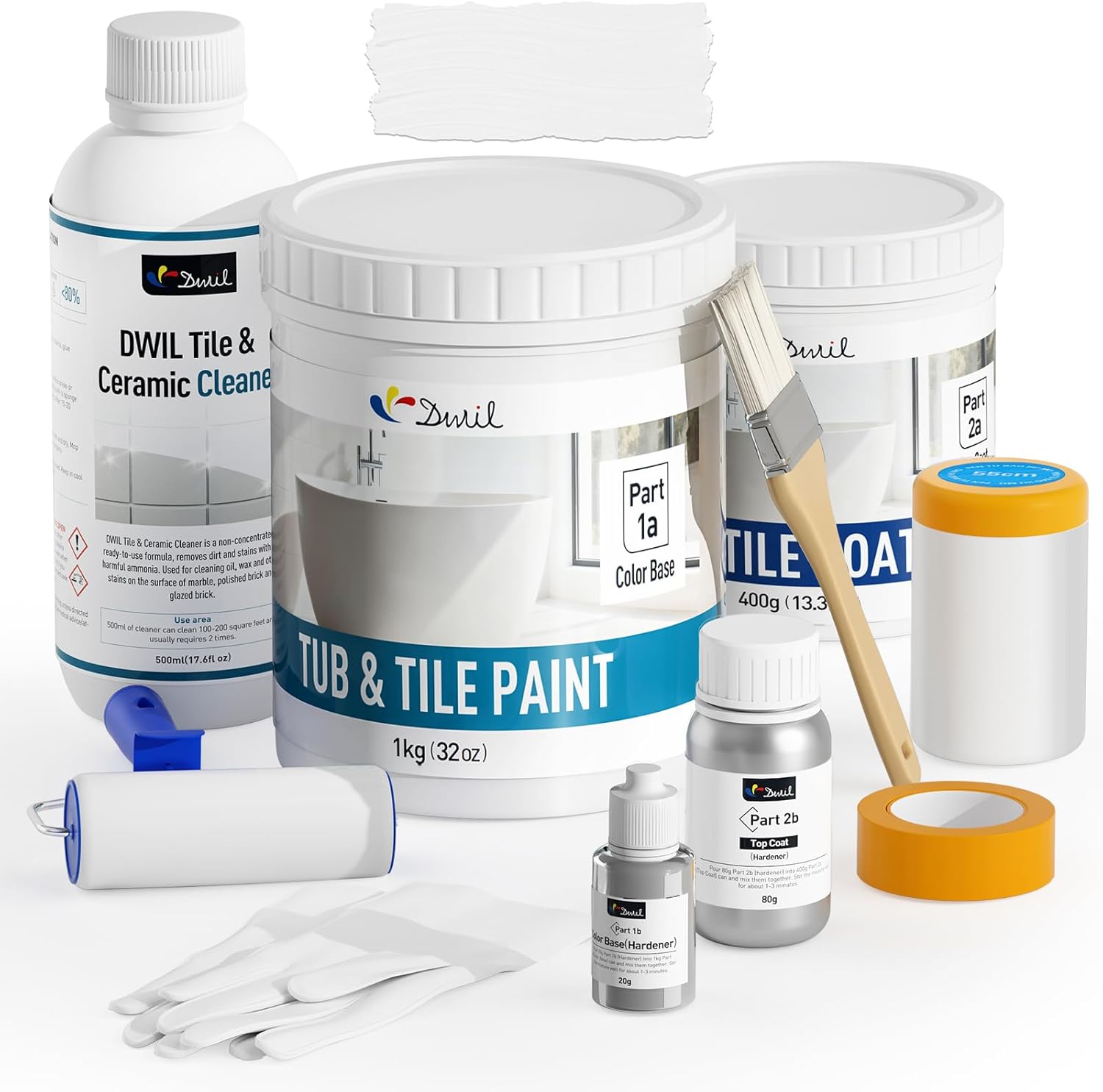 DWIL Bathtub Paint, Tub and Tile Refinishing Kit 32oz with Tools, Easy to Use Countertop Paint, Tub Refinishing Kit for Bathroom & Kitchen on Tile, Sink, 40-50sq.ft(White)