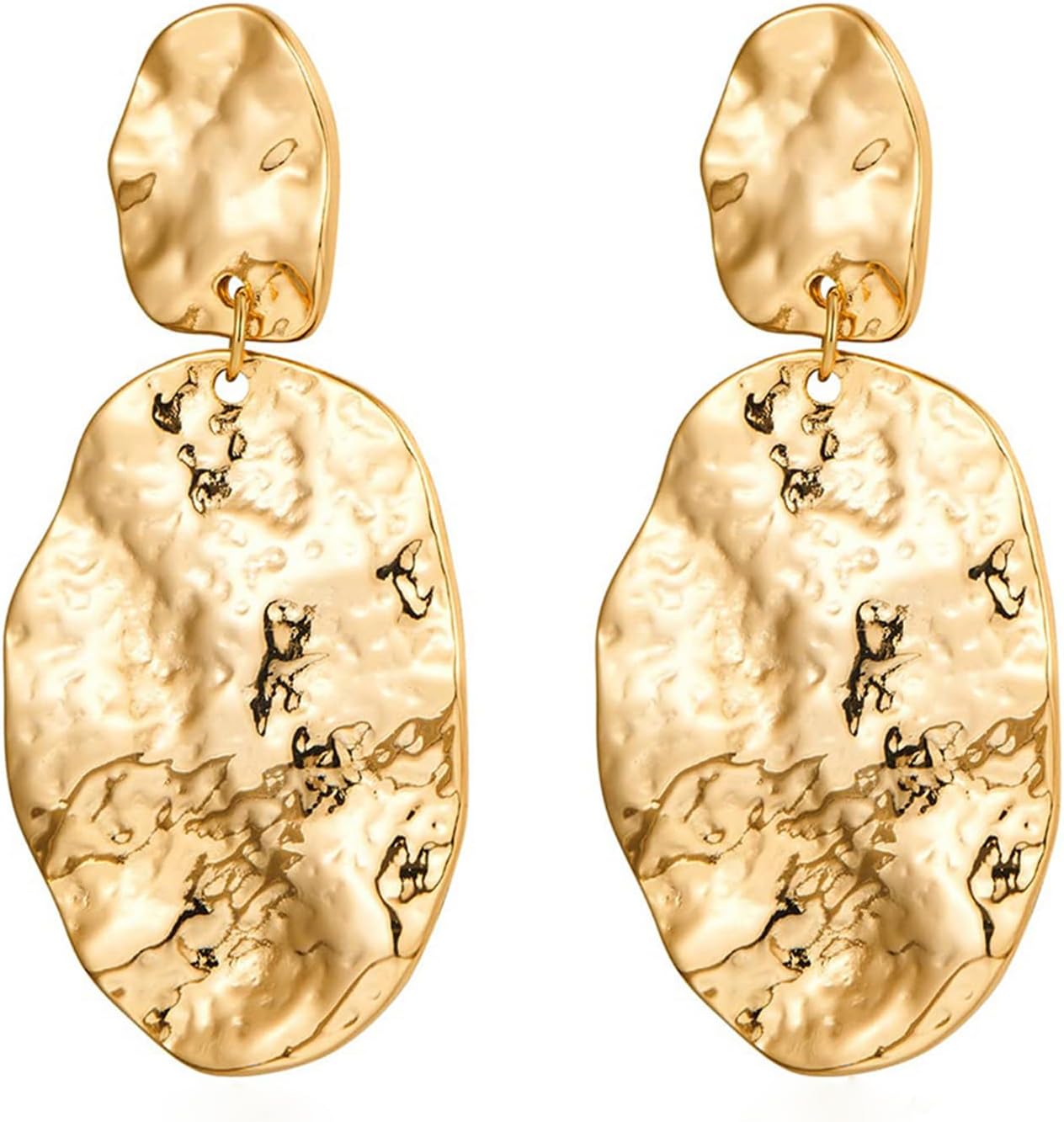 14K Gold Hammered Statement Earrings for Women,Vintage Large Oval Textured Drop Dangle Earrings Simple Matte Ear Jewelry Accessories Gift