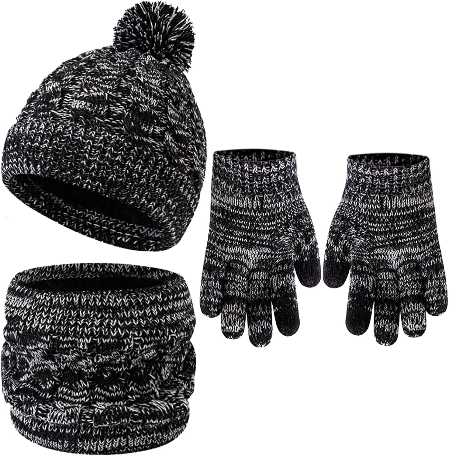 Kid Winter Hats Gloves Scarf Neck Gaiter Set, Warm Fleece Lined Beanie with Pompom Knit Gloves Kit for 3-10 Girls Boy