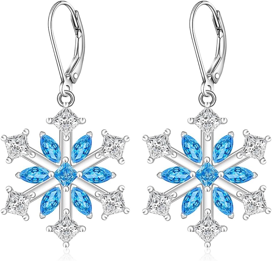 Snowflake Earrings for Women Dangle Womens Christmas Earrings Dangling Sterling Silver Snowflake Earrings Blue Leverback Winter Xmas Gifts