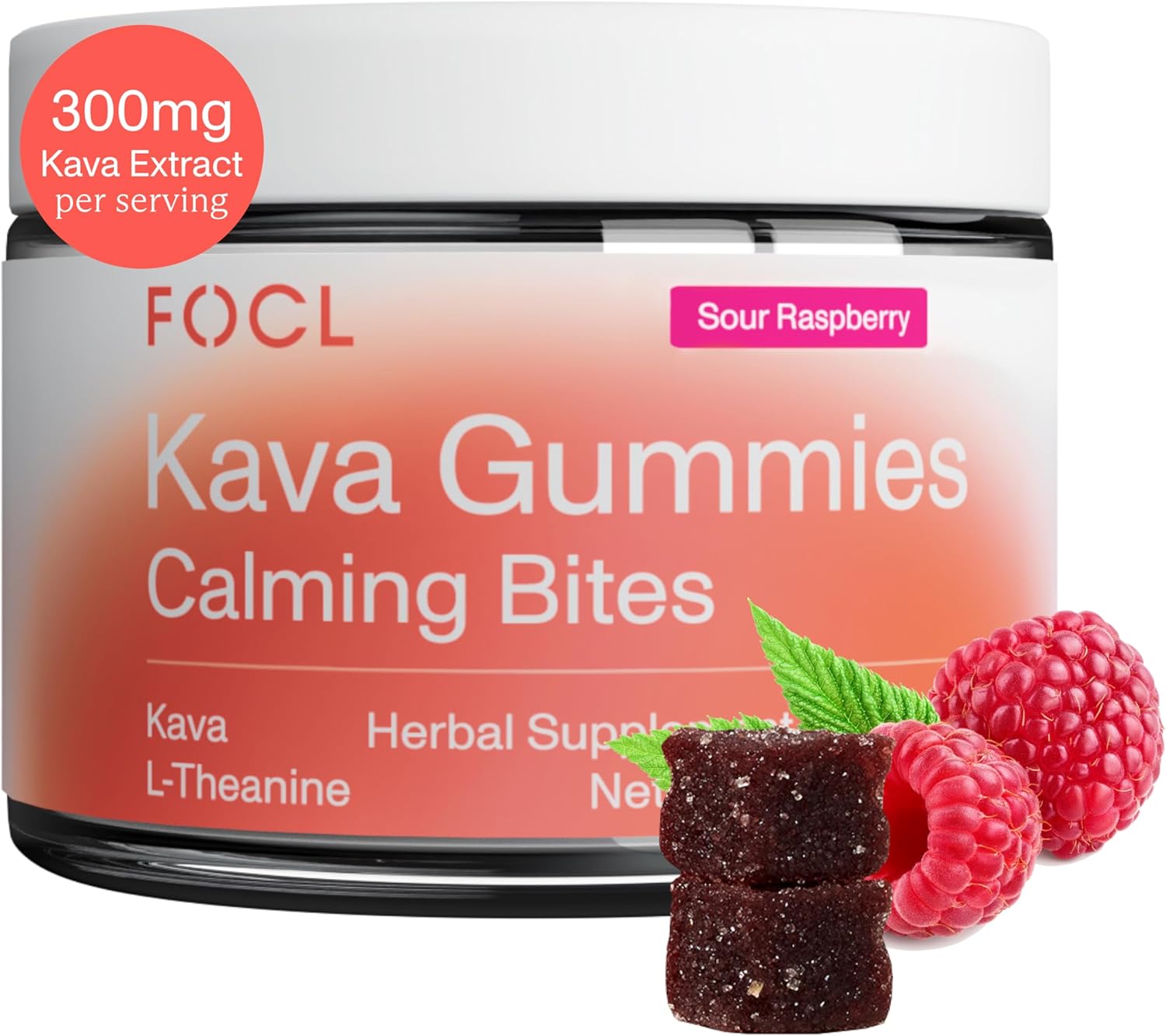 FOCL Kava Gummies Calming Bites - Calm and Relaxation Chewables with Kava Extract and L-Theanine - Plant-Based, Low-Calorie, Non-GMO Stress Gummies for Adults - Sour Raspberry, 30 Count