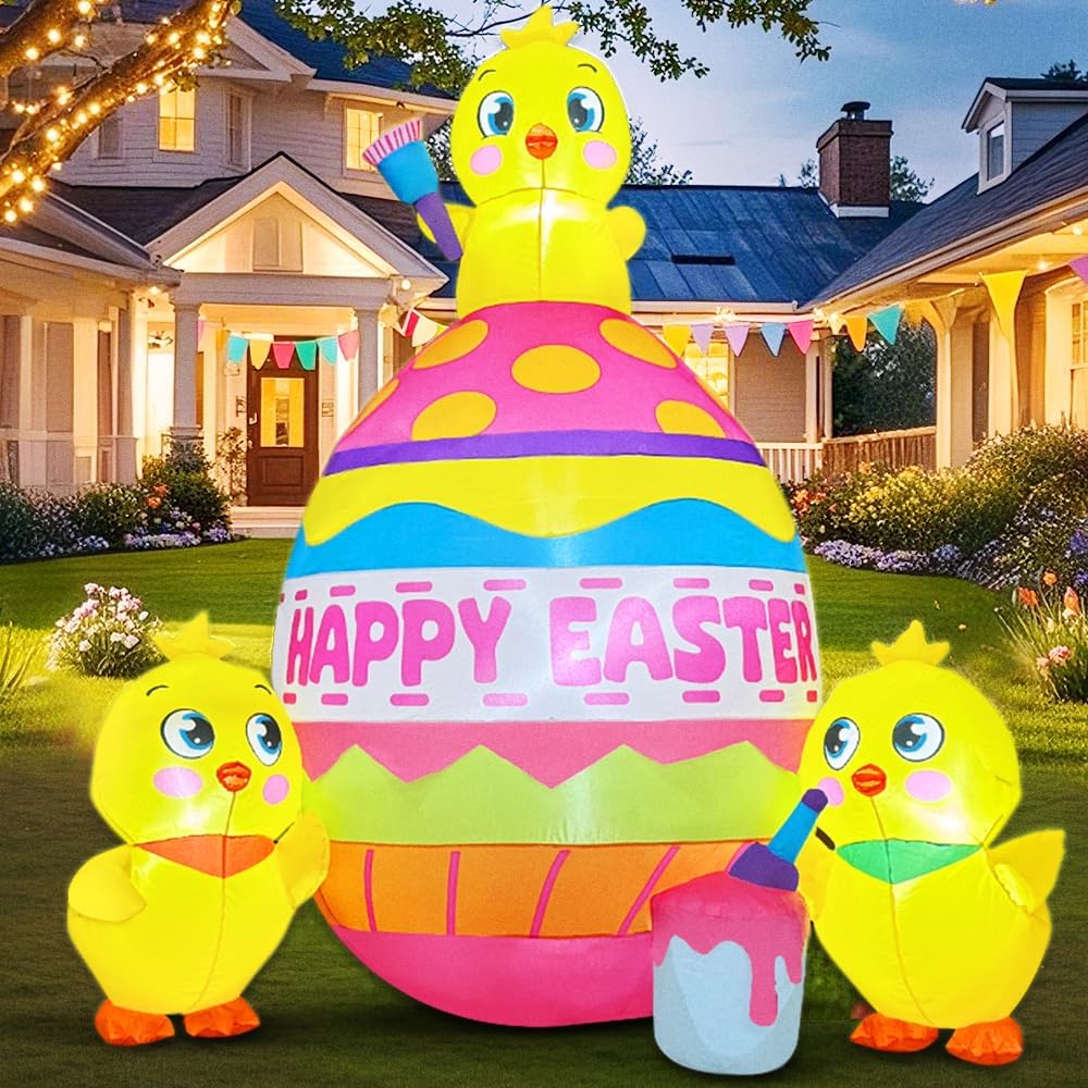 - You'll get a brand new 5.5 FT high Easter inflatable three chicks and colorful egg with Easter print outdoor decoration and includes blowers, ground posts and ropes, water bags, transformer adapter plugs, and more, all in a beautiful box. You can give it to your friends as a gift. Easter inflatable decor in your yard can bring holiday cheer to your neighbors, friends, and family, welcoming them with blessings.