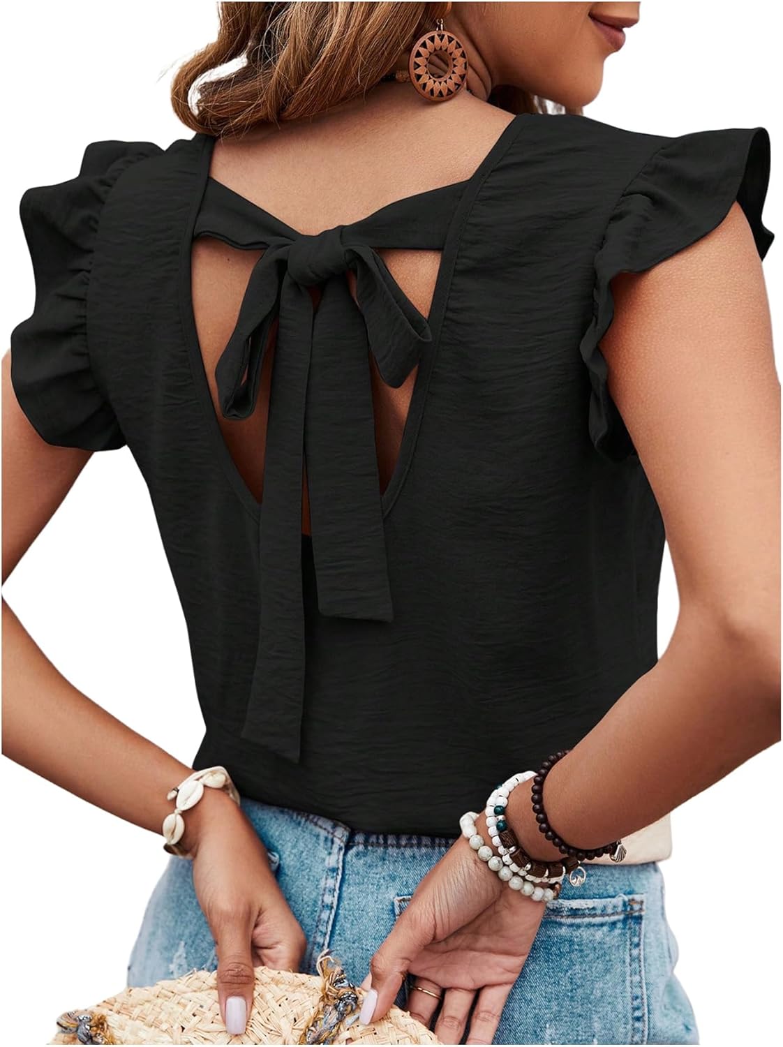 OYOANGLE Women's Bow Tie Back Ruffle Cap Sleeve Blouse Crew Neck Dressy Casual Summer Tops
