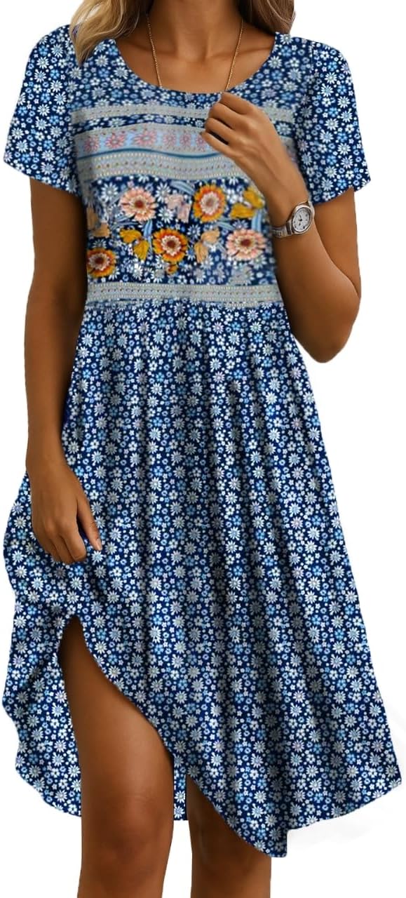 Womens Sundress 2025 Summer Boho Floral Short Sleeve Crewneck Midi Dress Casual A-Line Flowy Knee Lenth Dress with Pocket