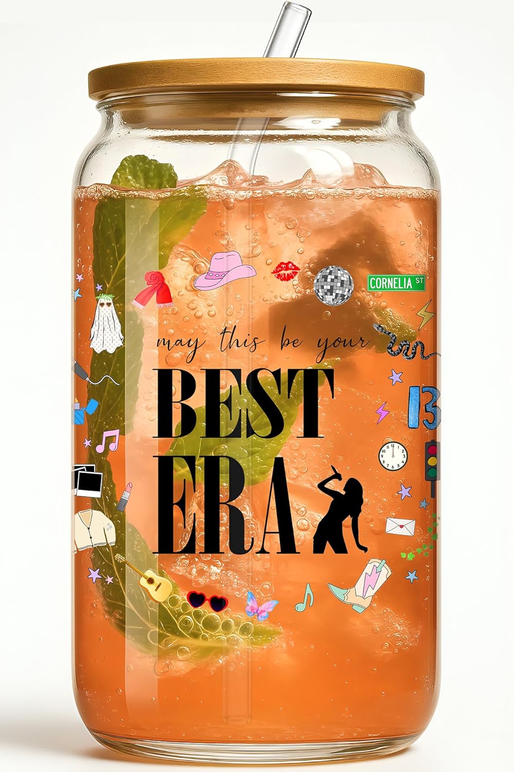 Taylor Best Era Glass Tumbler – 16oz Iced Coffee Mug Cup for Music Fans, Birthday Party Gifts for Girls Women, Christmas Stocking Stuffers Gift for Girls Boys, Taylor Gifts Merch
