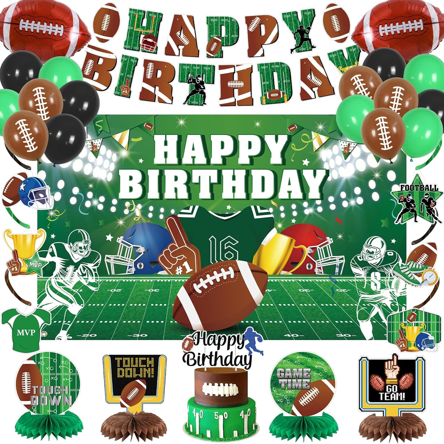- [Football Birthday Decor] - Our football birthday decorations set includes 1PC football "Happy Birthday" backdrop, 1PC green birthday banner, 15PCS latex balloons, 6PCS hanging swirls, 4PCS honeycomb table centerpieces, 1PC cake topper and 2PCS foil balloons. Beautiful design and enough quantity to meet your birthday party decoration needs