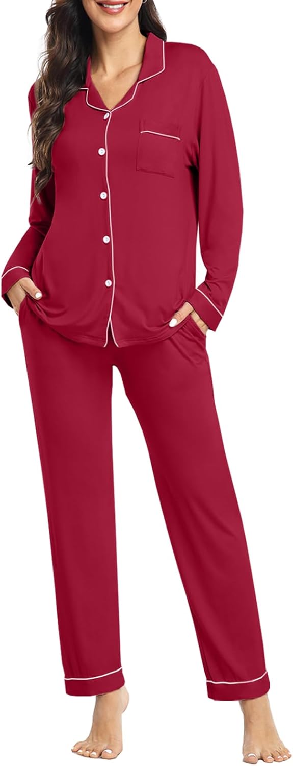 Womens Modal Button Up Pajamas 2 Piece Long Sleeve Comfy Pjs Sleepwear Soft Pajama Lounge Set Loungewear S-3XL
