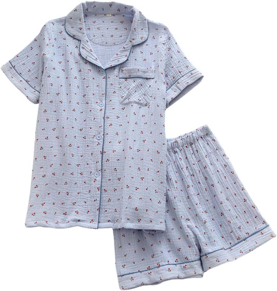 Womens Cute Pajama Set Short Sleeve Button Up Shirt and Shorts 2 Piece Cotton Pj Sets