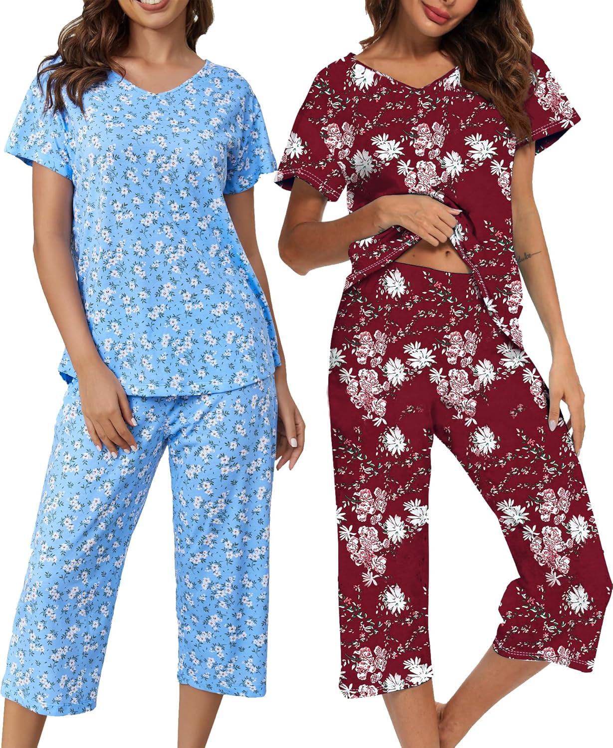 ENJOYNIGHT 2 Pack Womens Pajama Sets Cotton Short Sleeve Top with Capri Pants Summer Pjs Sleepwear