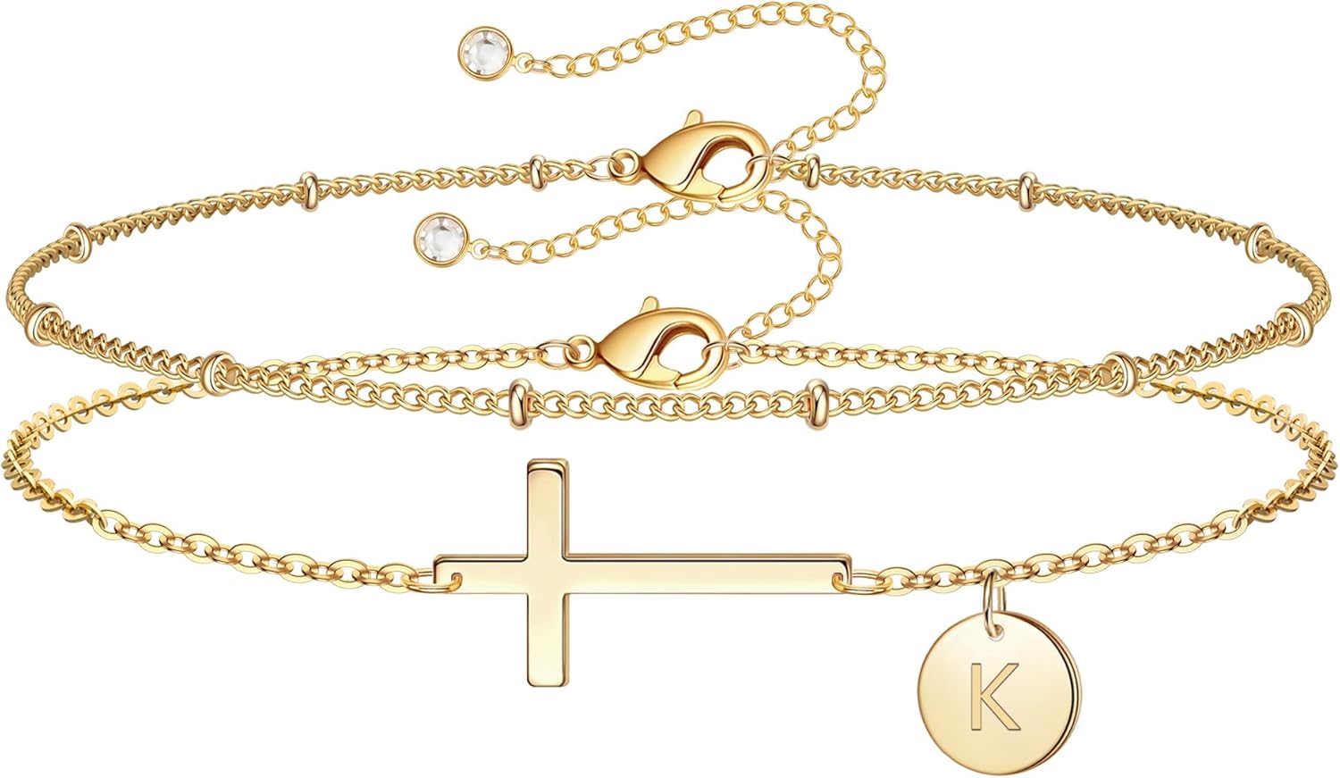M MOOHAM Valentines Gifts for Her Teen Girls Women - Initial Cross Bracelets for Women Teen Girls 14K-Gold-Plated Dainty Layered Cross Disc Bracelet Baptism Religious Christian Gifts for Kids