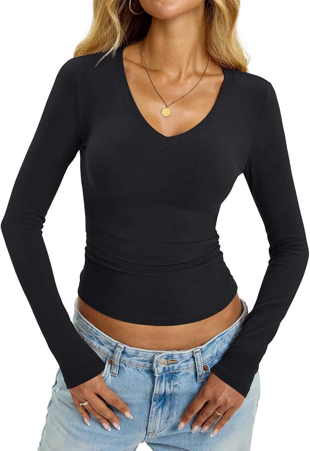 Womens Cotton Long Sleeve Shirts V Neck Slim Fit Tops Basic Tees Going Out Outfits 2025 Fall Spring