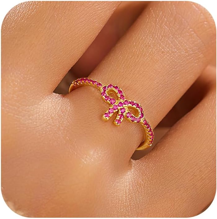 Pink Bow Rings for Women 14K Gold Plated 925 Sterling Silver Rings Mother Daughter Knot Rings Dainty Cubic Zirconia Stackable Rings Jewelry
