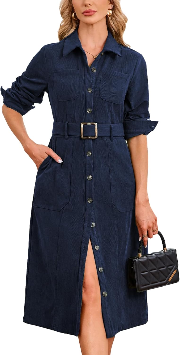 Women's Corduroy Midi Dress Long Sleeve Belted Button Down Shirt Long Dress with Pockets
