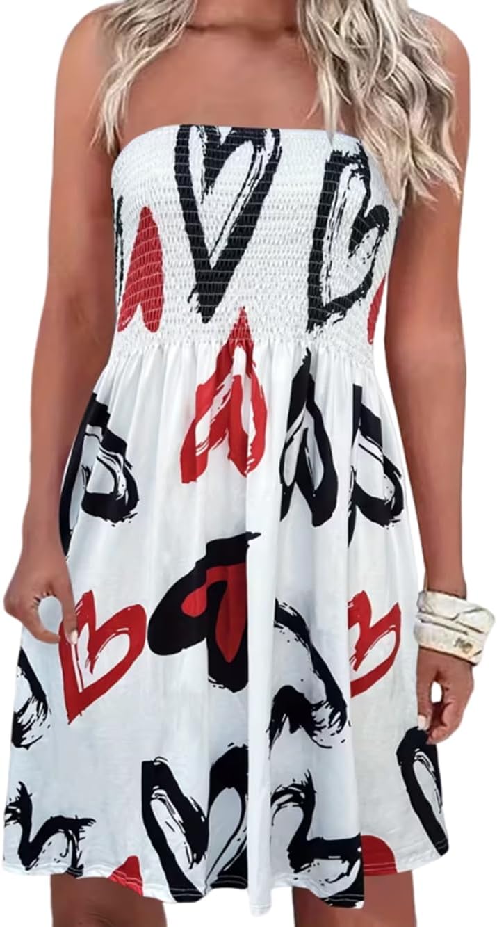 Summer Sexy Smocked Strapless Bandeau Dress for Women Beach Boho Strapless Cover Ups Off Shoulder Floral Sundresses