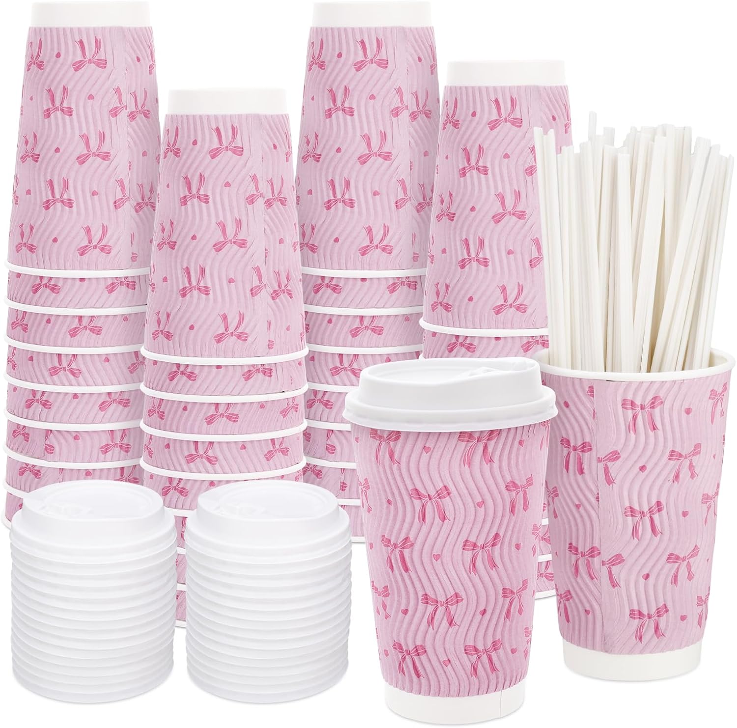 50 Set 16 Oz Pink Bow Disposable Coffee Cups with Lids and Straws Coquette Bowknot Corrugated Paper Drinking Cups for Hot Cold Drinks Birthday Baby Shower Bachelorette Party Supplies