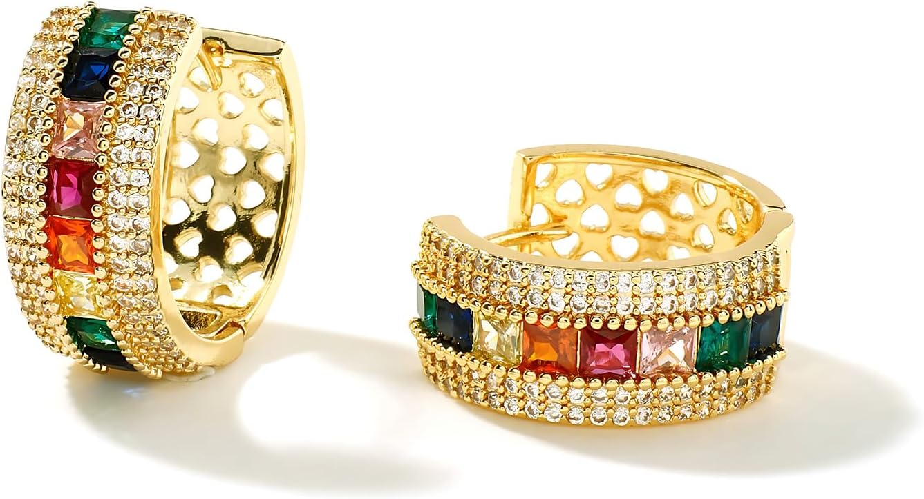 Gold Plated Wide Hoop Earrings for Women with Multicolor Cubic Zirconia – Statement Chunky Huggie Earrings Jewelry Gift