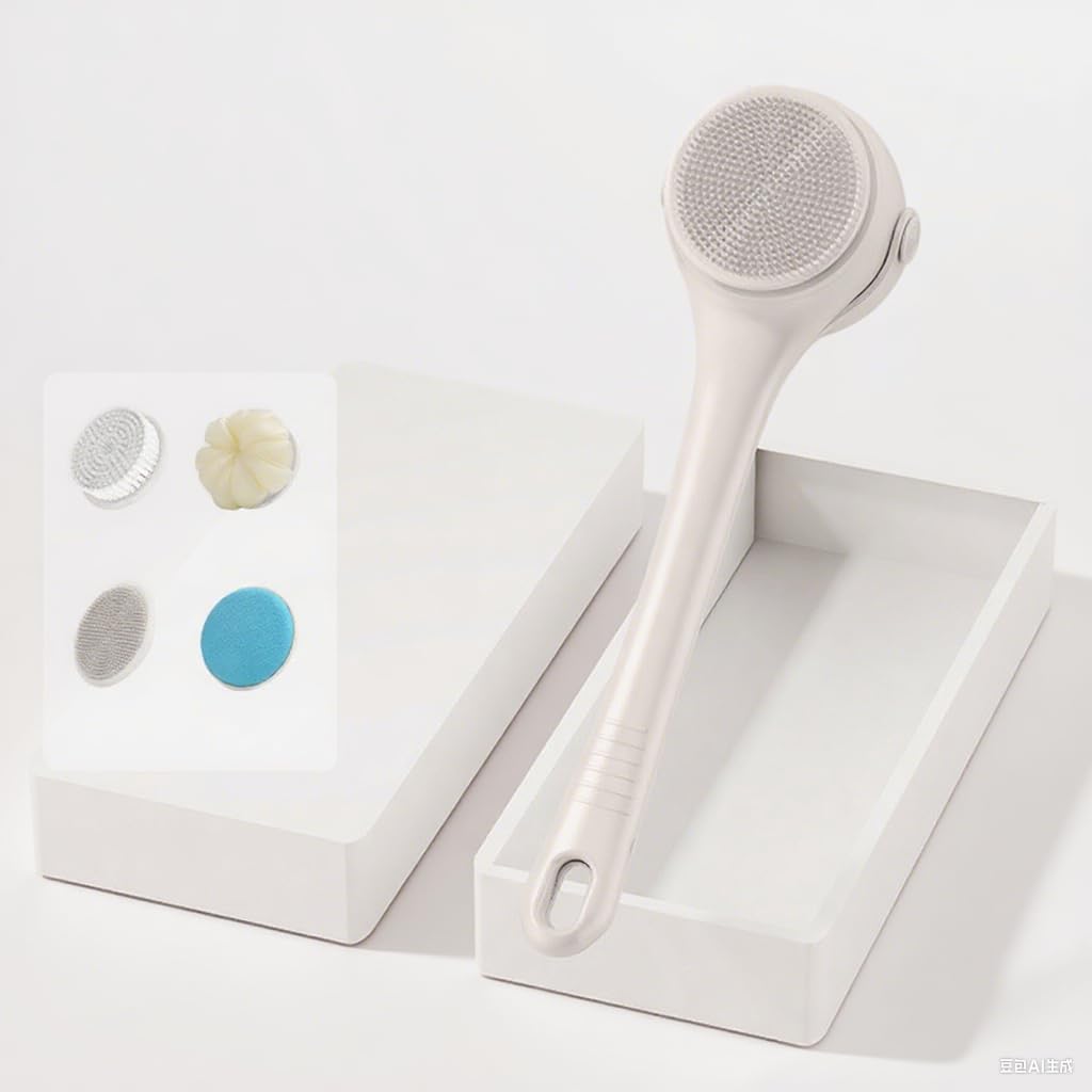 - 4-in-1 Versatile Grooming Solution -- The shower brush for body is equipped with 4 interchangeable heads (soft bristles for deep cleaning, silicone nodes for massage /exfoliation, sponge for lathering), this brush adapts to every need—from daily cleansing to spa-level exfoliation. Perfect for tackling back acne, dry skin, or simply relaxing muscles.