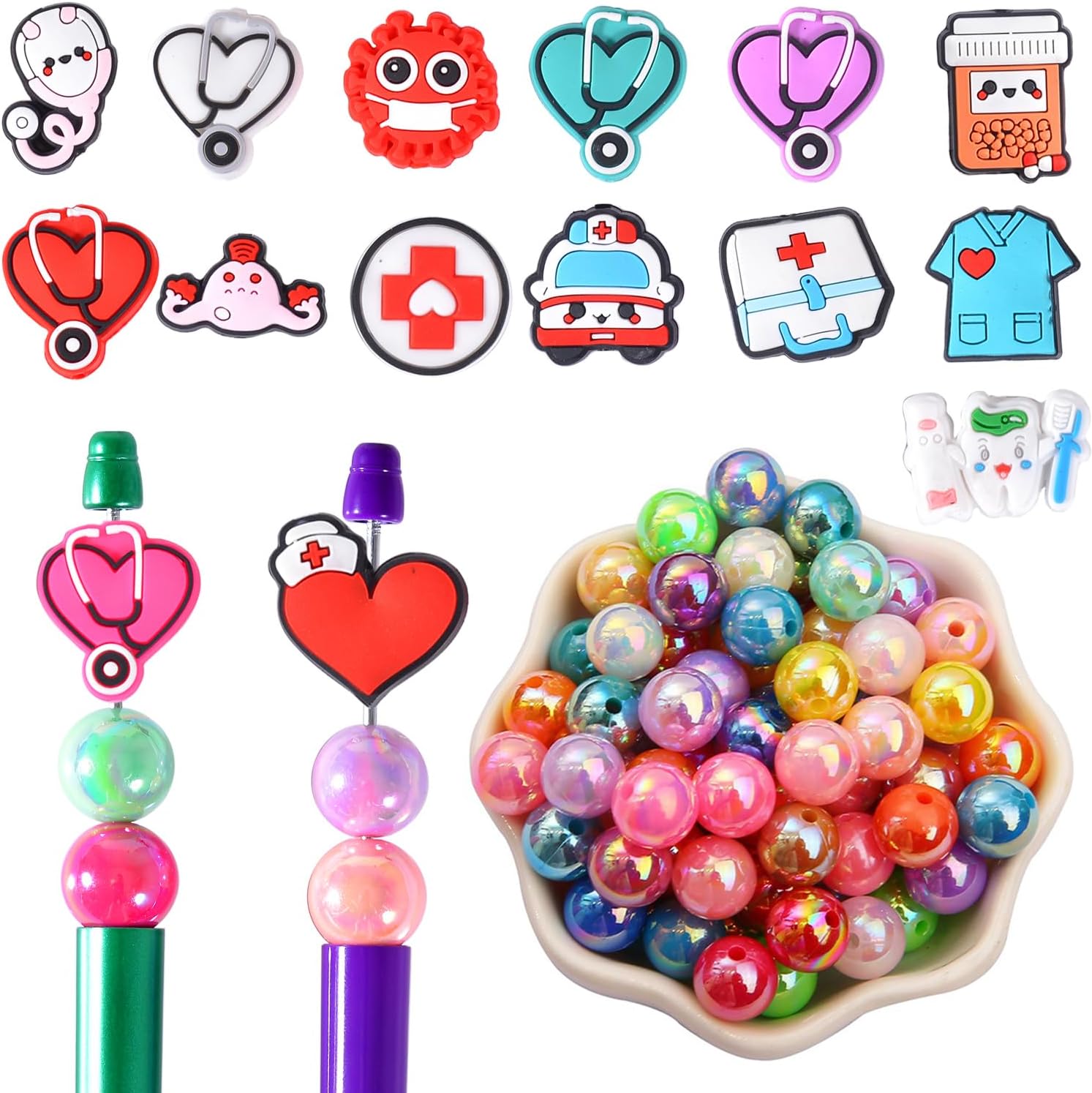 - Vibrant Colors: Acrylic beads in assorted colors, silicone focal beads with Nurse charms for decorative flair.
