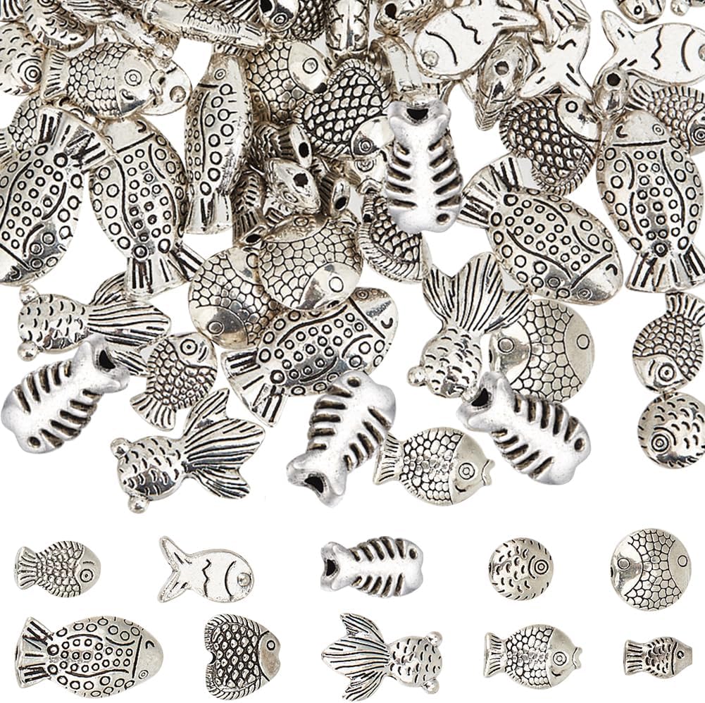 SUNNYCLUE 100Pcs Fish Beads Bulk Fishes Spacer Beads Tibetan Antique Silver Alloy Ocean Animal Loose European Vintage Bead for DIY Earring Necklace Bracelet Jewelry Making Findings Accessories