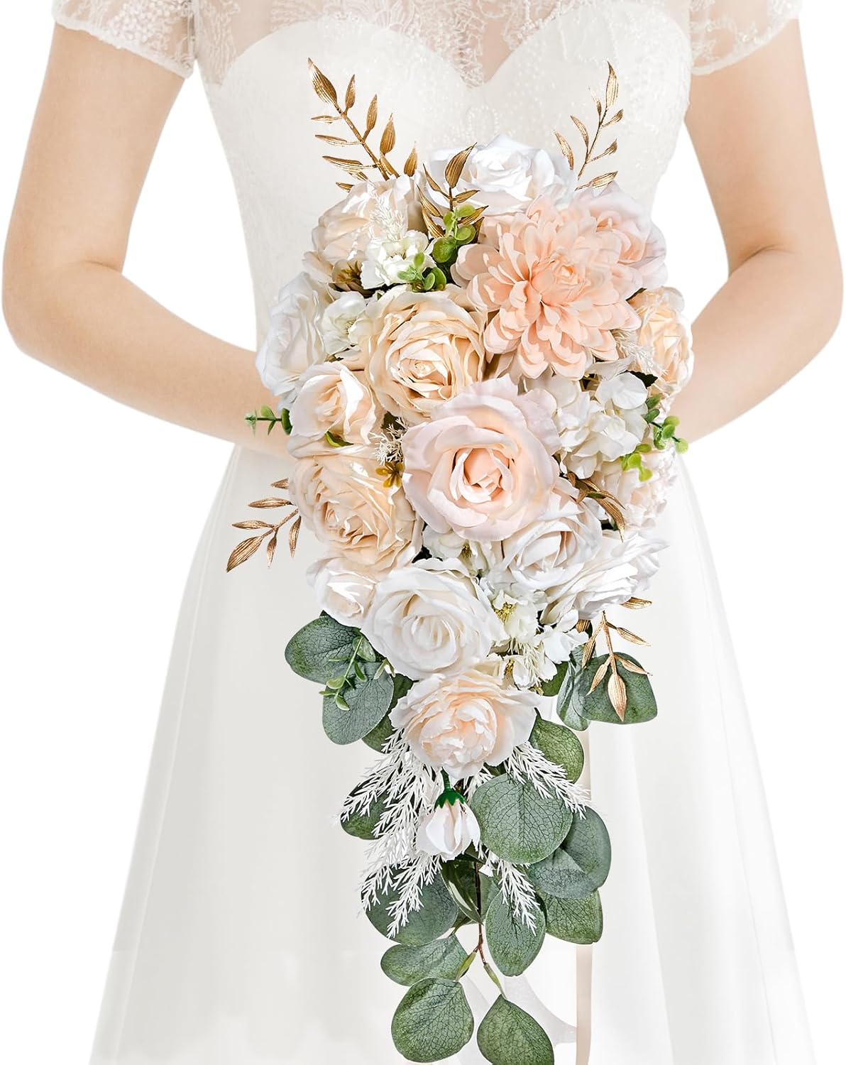 Wedding Bouquets for Bride, Champagne Cascading Bridal Bouquet Artificial Flowers,9.8 Inch Bride Bouquets for Wedding Decoration, Boho Ceremony,Church, Anniversary Decor