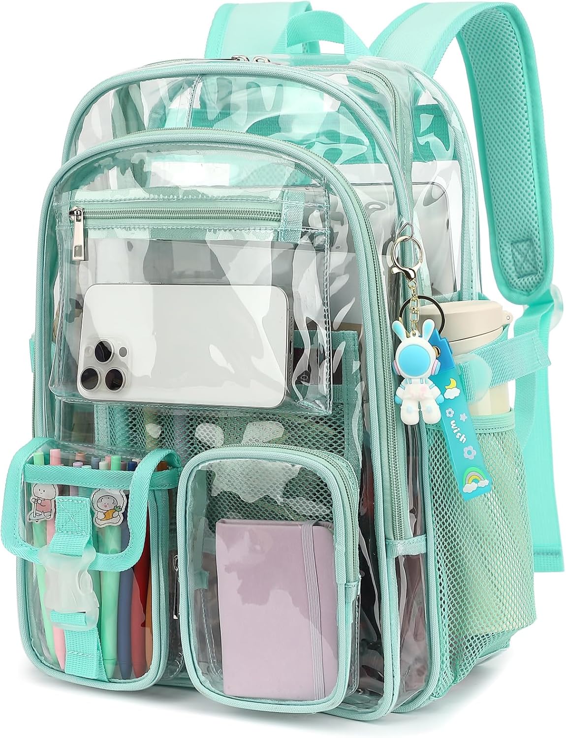 - Material: Clear backpack is made of water-resistant PVC plastic material, Completely transparent all around, great for seeing inside and quickly finding what you need.