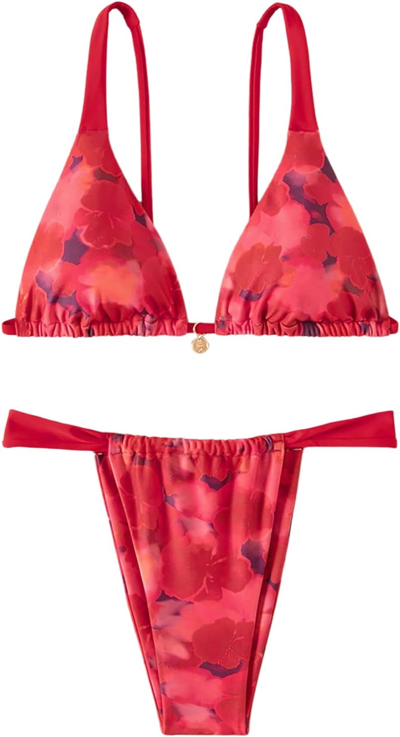 MakeMeChic Women's Floral Print 2 Piece Bikini Sets Tie Back Triangle Thong Bathing Suit Swimsuit