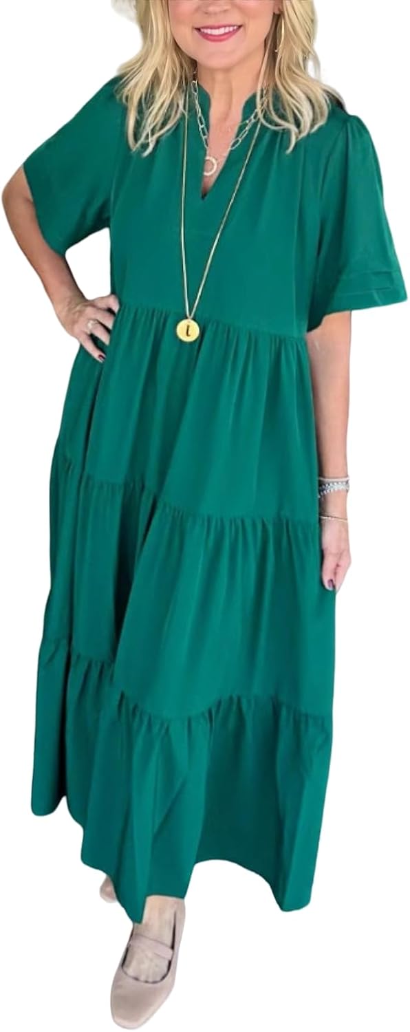 Womens Tiered Maxi Dress Summer Casual V Neck Short Sleeve Long Flowy A line Dresses for Women