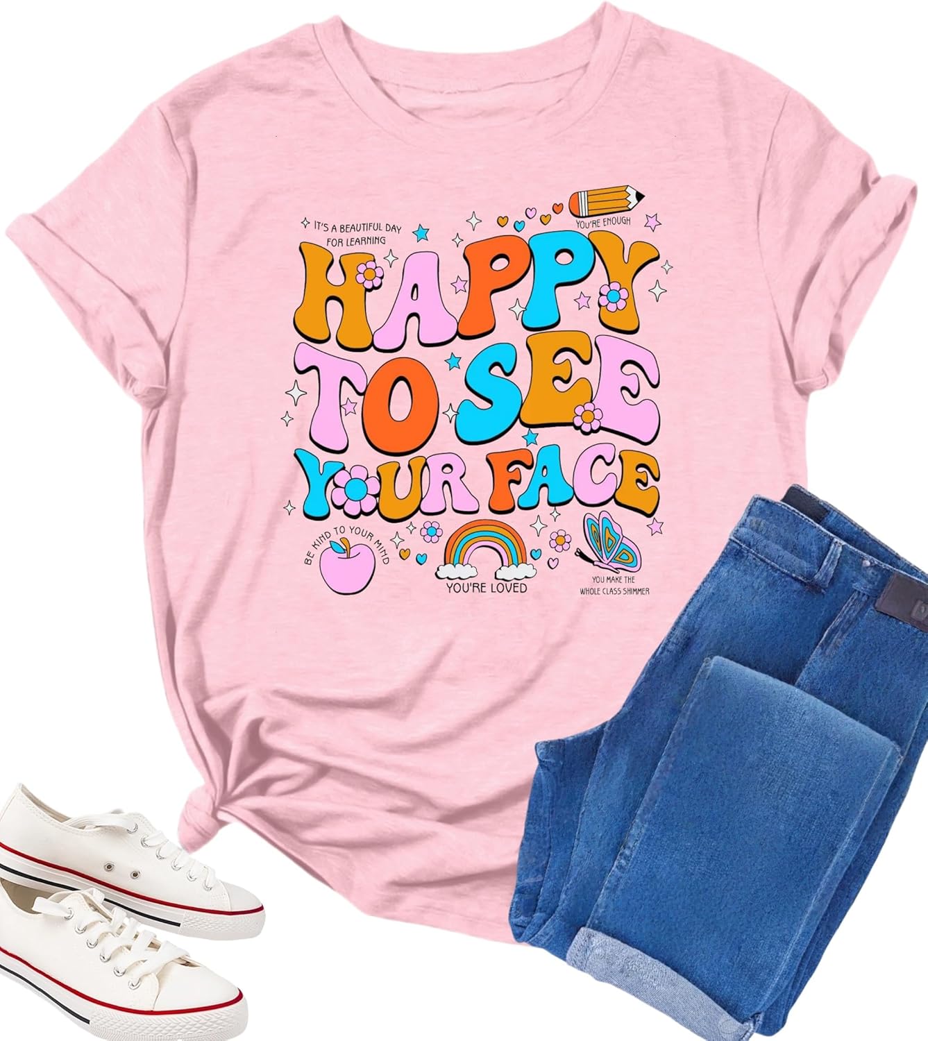 First Day of School Shirt Women Happy to See Your Face Teacher Shirt Cute Teacher Gift Funny Teach Graphic Tees