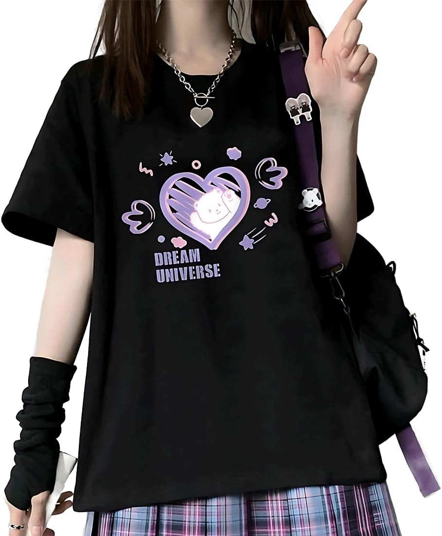 ZLMuMulin Kawaii Fashion Harajuku Goth Style Casual Crewneck Soft Cute Cartoon Bear Dream Universe Print T-Shirt