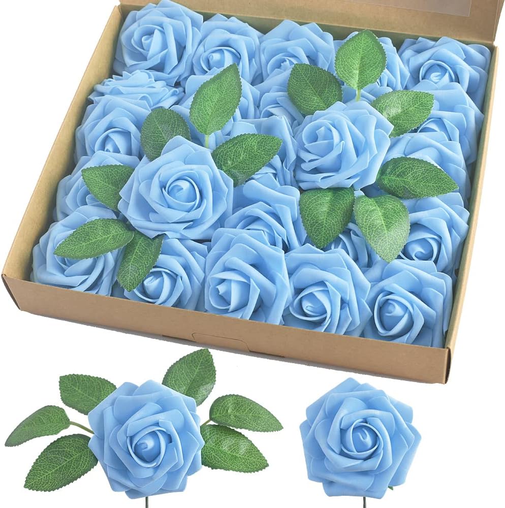 homEdge Artificial Rose, 25pcs Foam Artificial Flowers with Stem for Home Decorations, Wedding Bouquets, Party, Certerpieces, Anniversaries-Aqua Blue