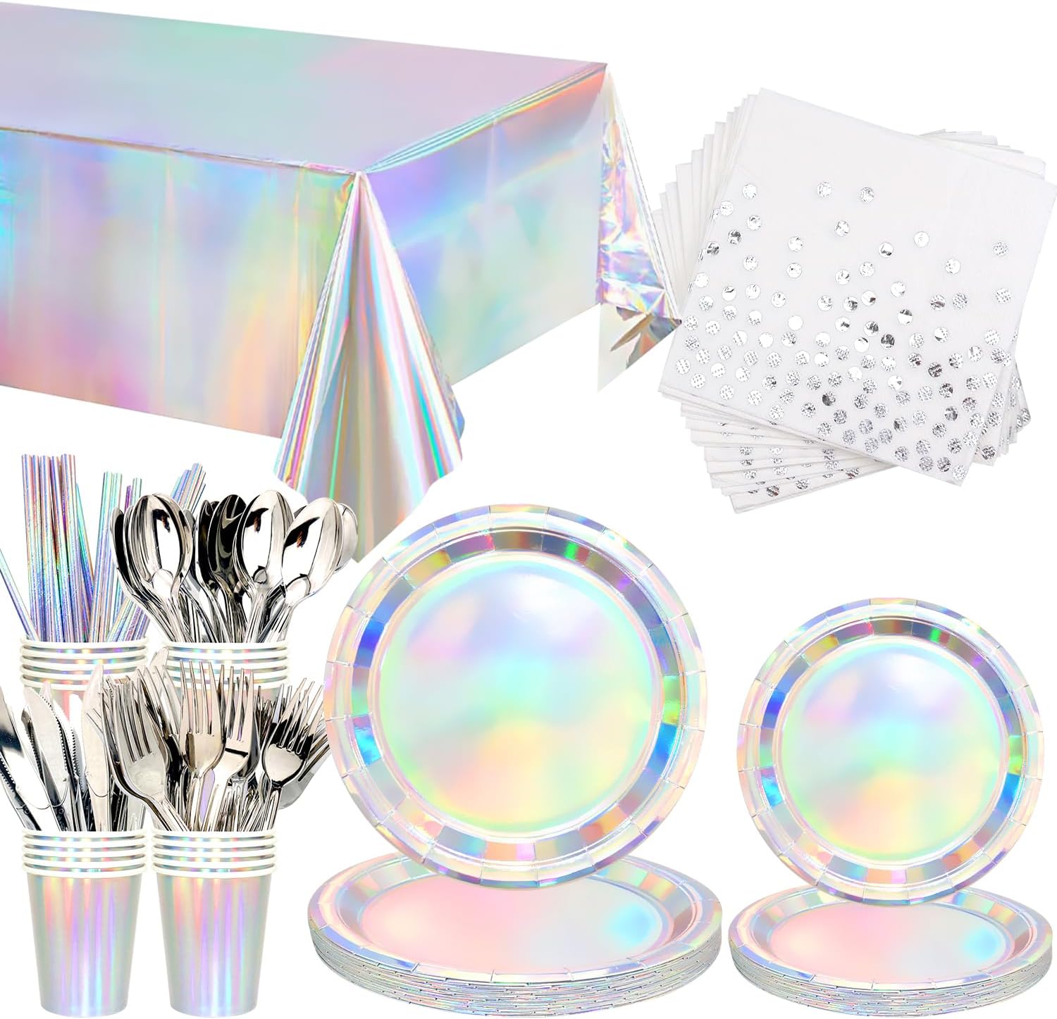 - Iridescent Birthday Party Supplies: You will get 20PCS 9" Iridescent dinner plates +20PCS 7" Iridescent dessert plates + 20PCS 9oz Iridescent paper cups + 20PCS silver napkins + 25PCS Iridescent straws + 20 set Iridescent silver forks & knives & spoons + 1PC Iridescent shiny table cover.