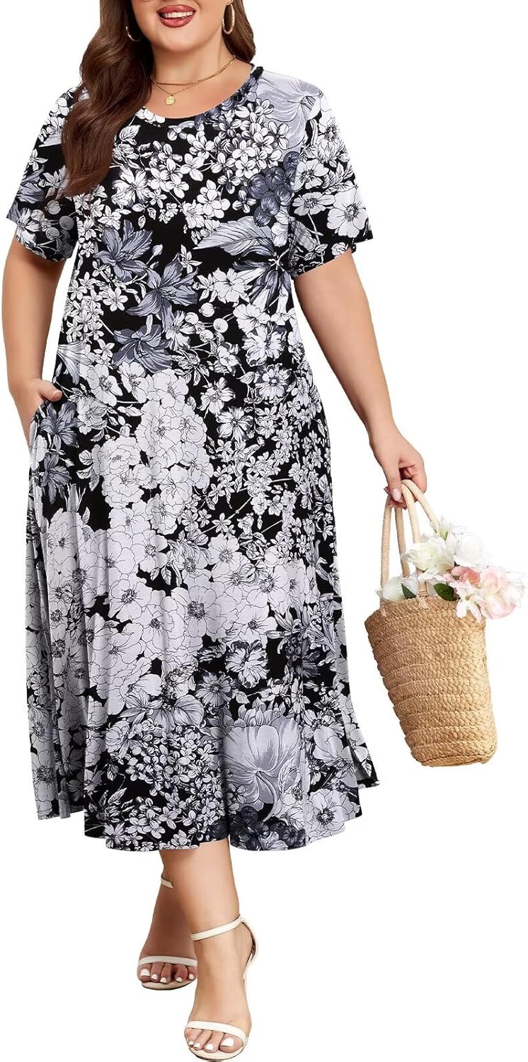 BELAROI Women Maxi Dress Casual Summer Crew Neck Short Sleeve Midi Tshirt Dress with Pockets Beach Cover Ups