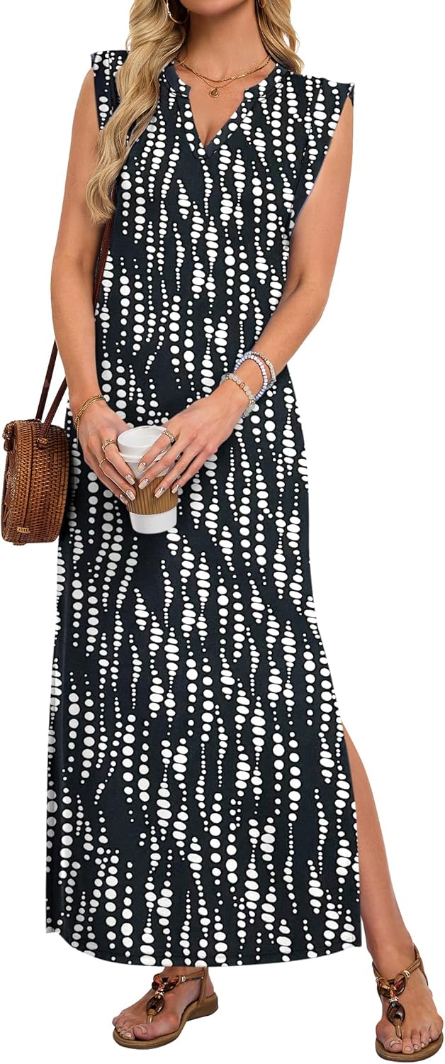 AUSELILY Women's V Neck Maxi Dresses, Straight-Cut Wrinkle-Free, Summer Split Sleeveless Vacation Dress with Pockets 2026