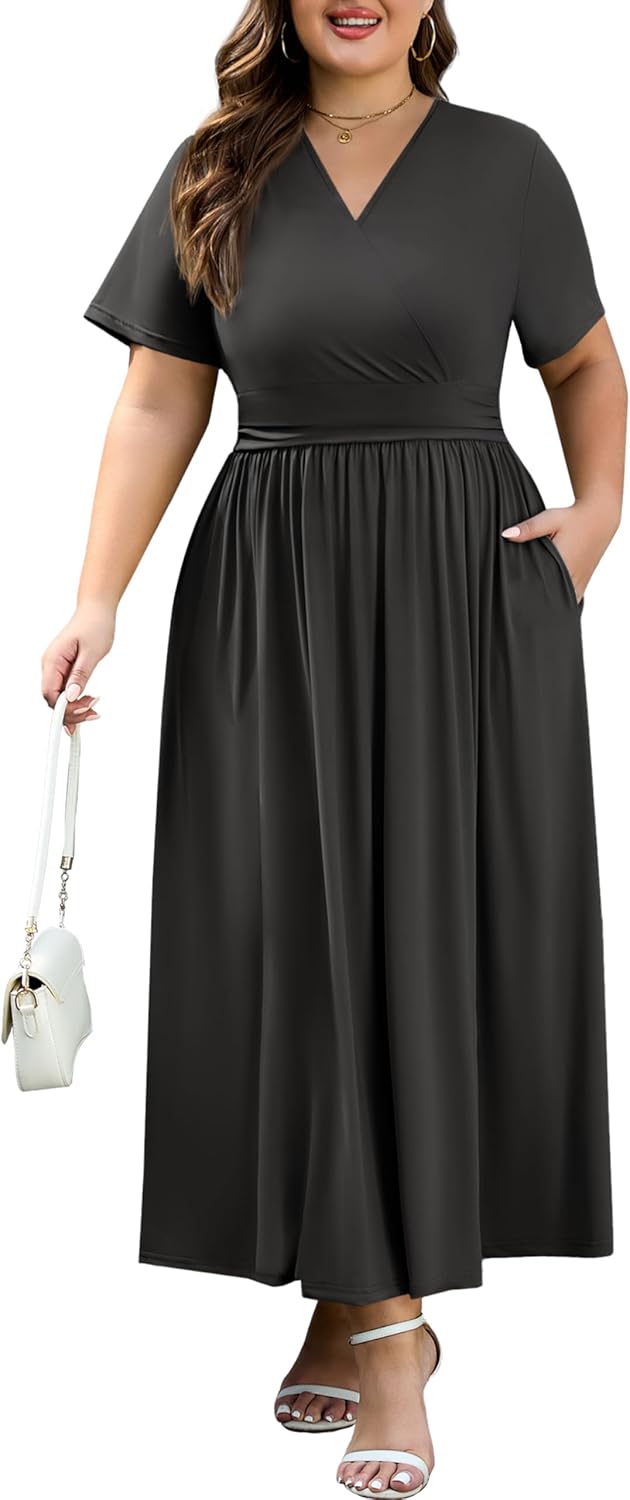 Plus Size Maxi Dresses for Curvy Women Short Sleeve Wrap V-Neck Summer Dress with Pockets