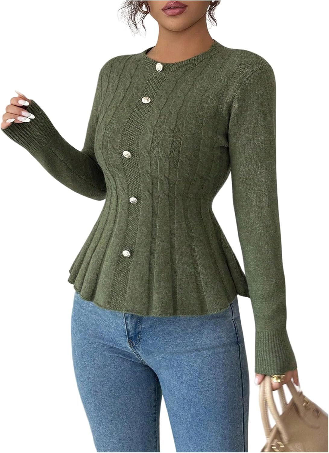 GORGLITTER Women's Cable Knit Peplum Tops Long Sleeve Crew Neck Sweater Jumper Top