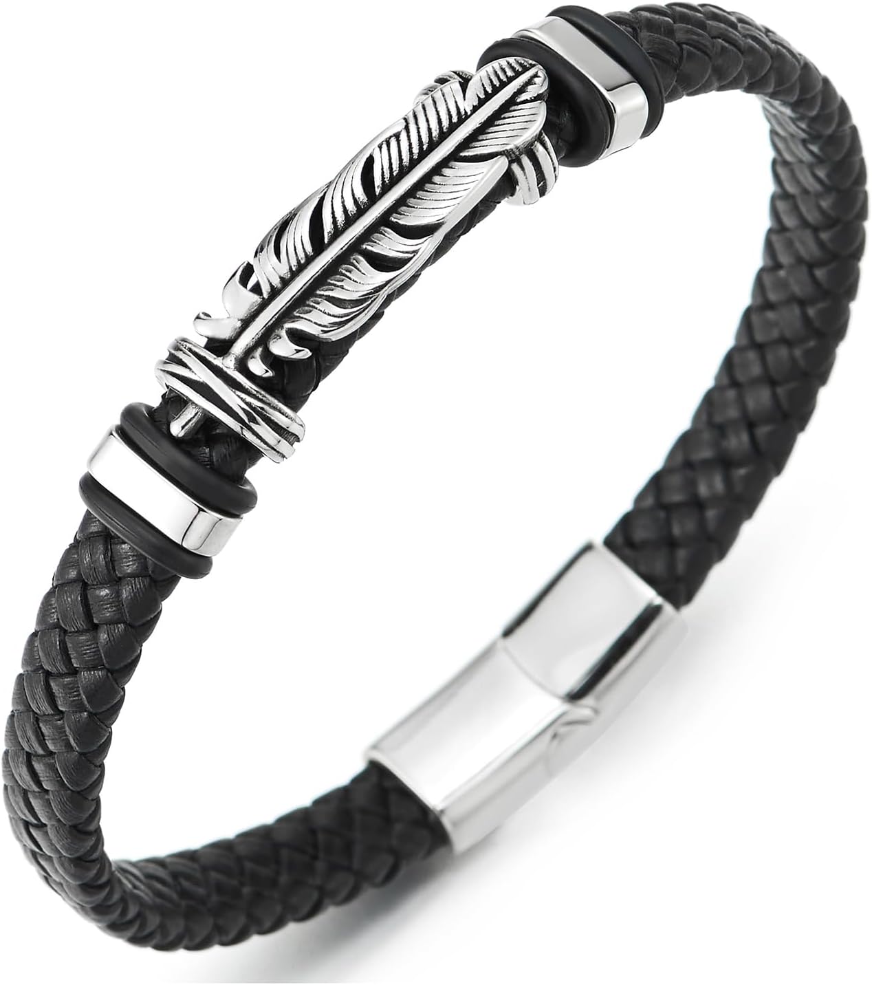 COOLSTEELANDBEYOND Vintage Feather Leaf Leather Bracelet, Steel Black Braided Leather Wristband for Men Women