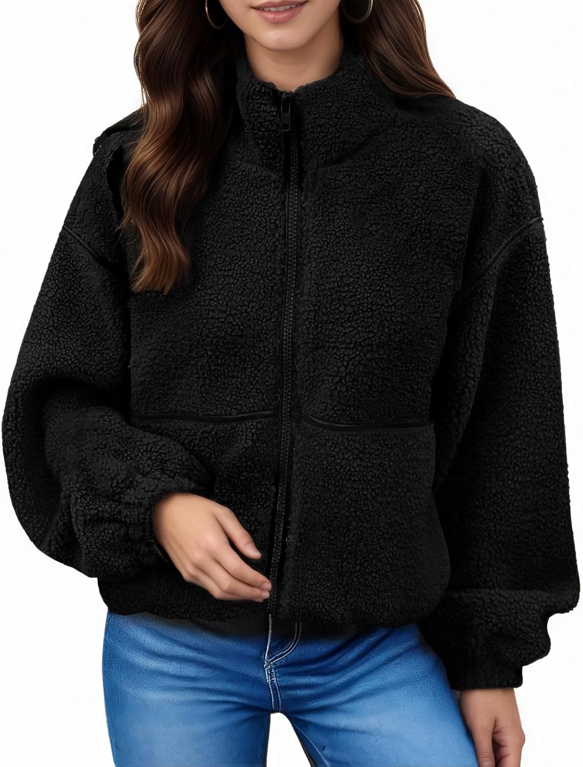 Womens Sherpa Jackets Teddy Faux Fur Fleece Coats Oversized Zip Up Long Sleeve Warm Outerwear Jacket with Pockets
