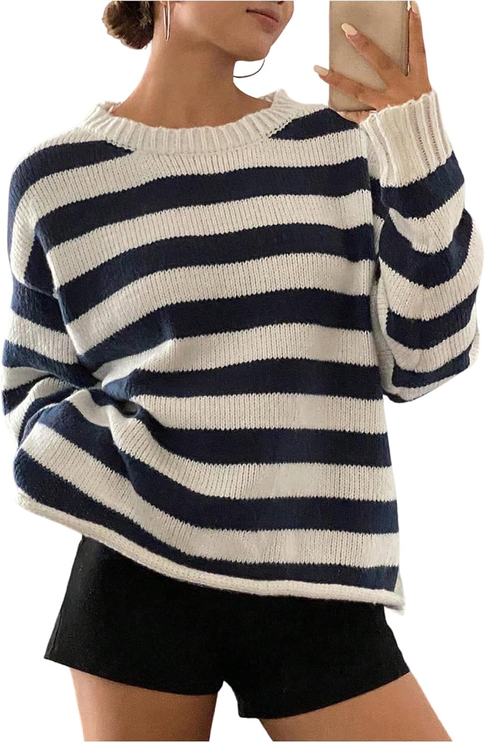 Women's Striped Knit Sweater Crew Neck Loose Fit Jumpers Pullover Sweaters