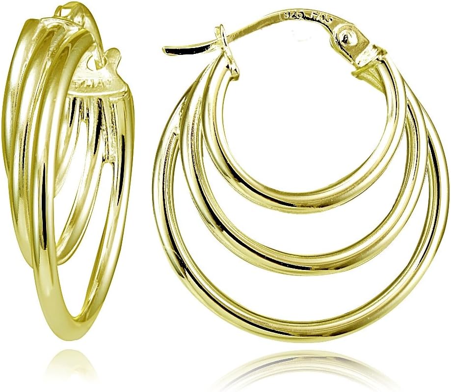Hoops & Loops 925 Sterling Silver Triple Round Stacked Hoop Click-Top Earrings for Women, Silver, Yellow Gold & Rose Gold