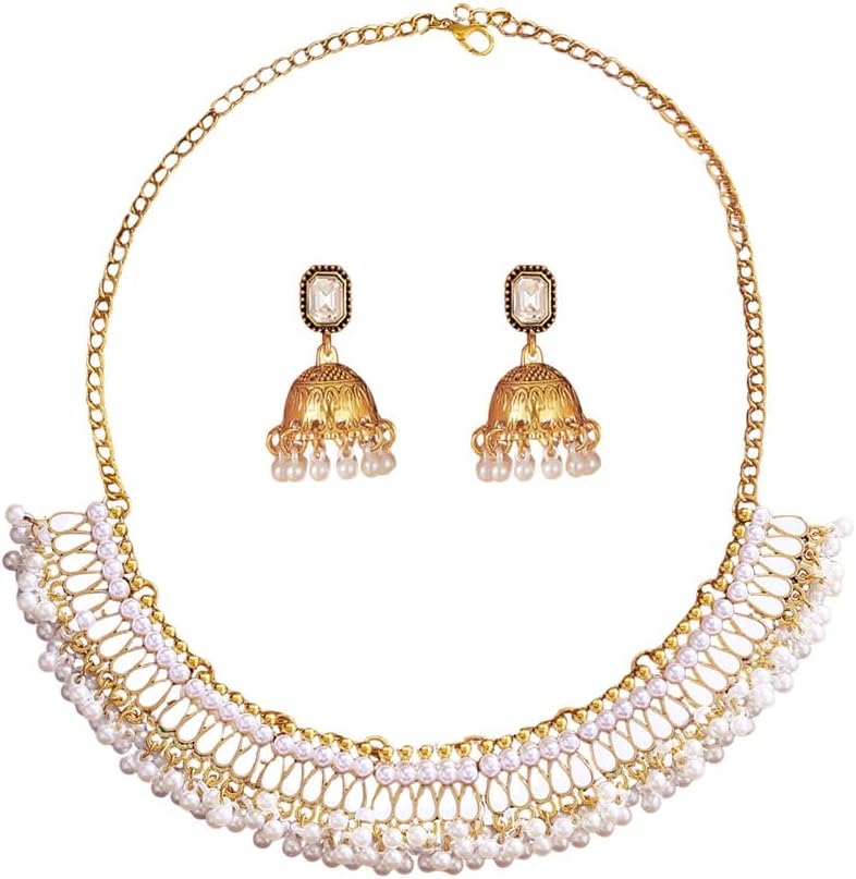 Bohemian Jhumka Earring Necklace Set for Women Bride Wedding Bollywood Crystal Pearl Beaded Antique Gold-Tone Indian Bell Jhumki Dangle Earrings Choker Necklace Ethnic Festive Party Wear Jewelry