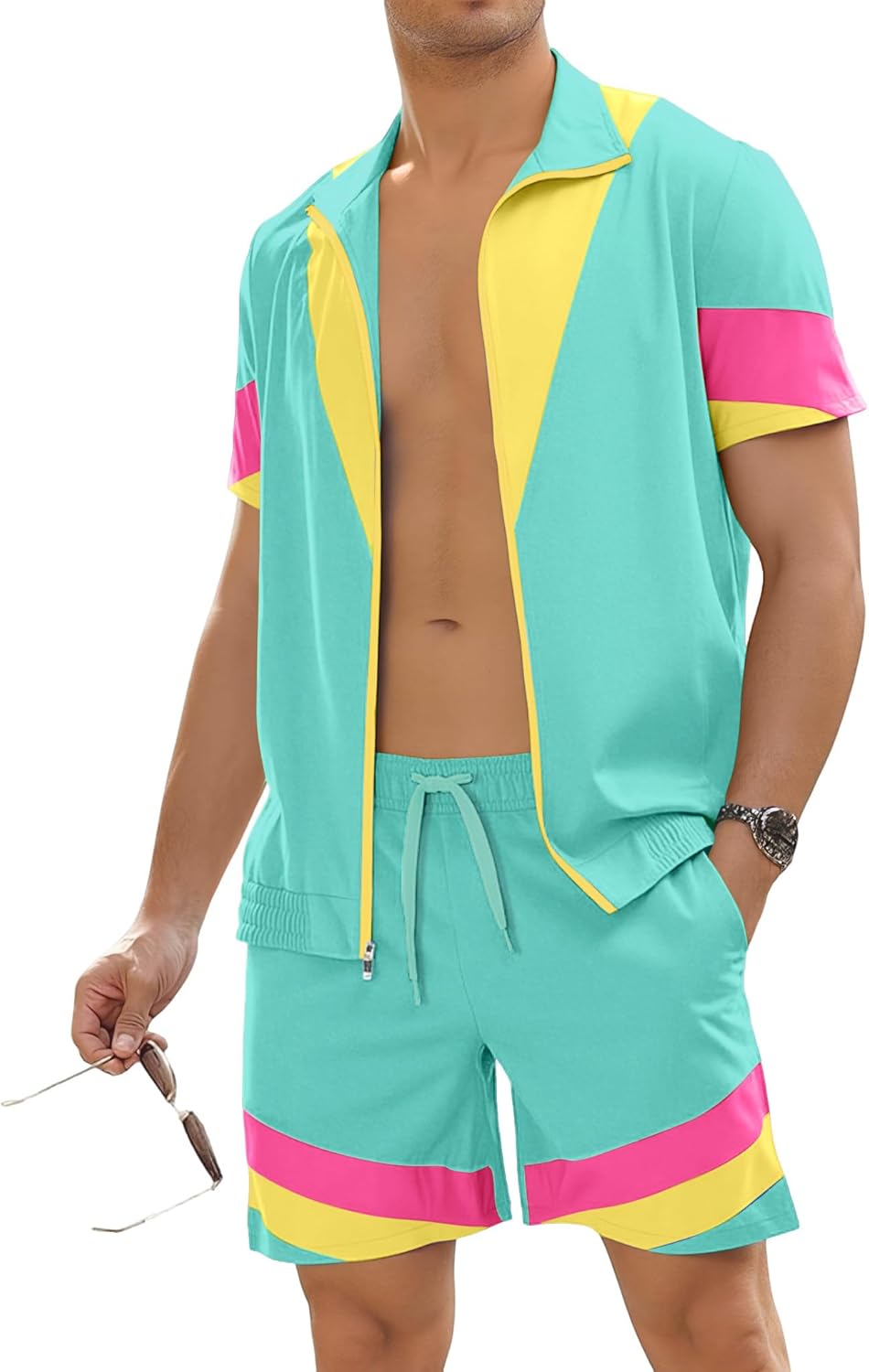 UOUA 80s Outfit for Men 90s Color Block Costumes 2 Piece Retro Short Sleeve Jacket & Shorts Set for Party