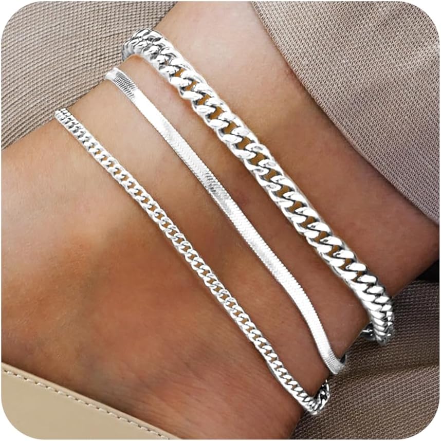 Plus Size Ankle Bracelets for Women - Extra Large 10"+2" Adjustable Anklet 14K Real Gold Plated Anklet Cuban Link, Figaro, Rope, Snake Herringbone - Summer Beach Waterproof Foot Jewelry