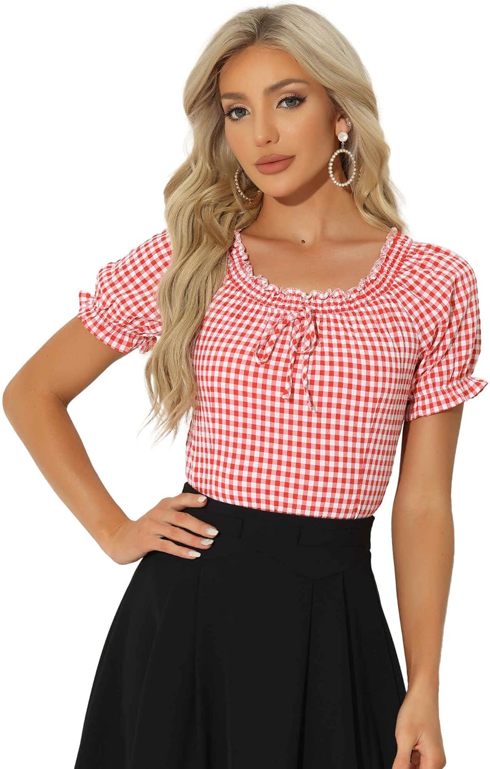 Allegra K Summer Gingham Tops for Women's Plaid Peasant Round Neck Ruffles Cute Puff Sleeve Tops